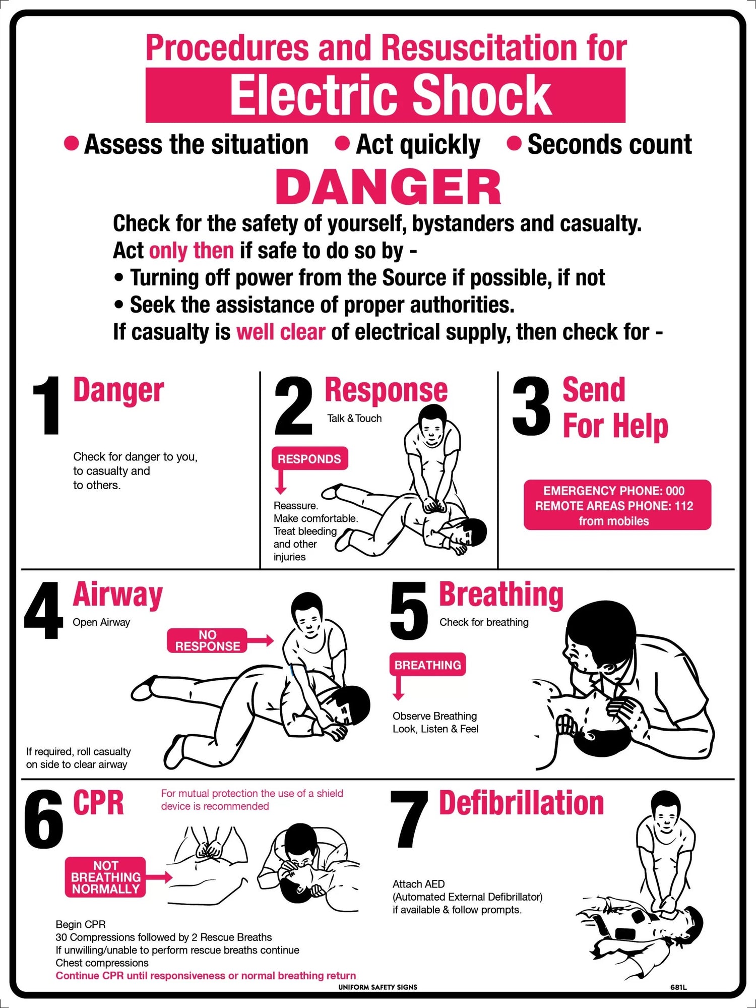 - The sign's striking red, black, and white design guarantees high visibility, while the clearly outlined steps and accompanying pictographs offer straightforward instructions for effectively managing electrical shock incidents.