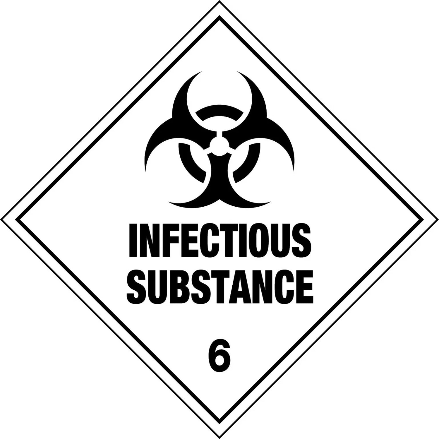 - Bold black text and a highly recognisable infectious substance pictogram.
