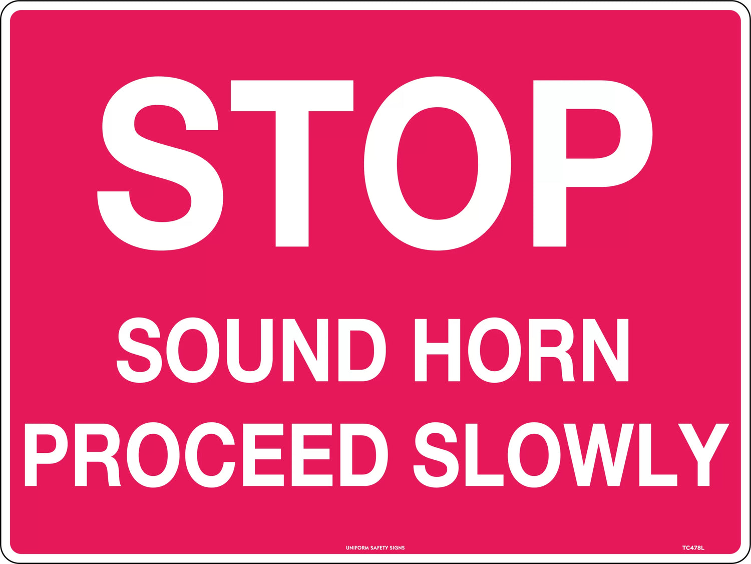 Multi-purpose Road Sign- Stop Sound Horn Proceed Slowly displaying "STOP," "SOUND HORN," and "PROCEED SLOWLY" instructions. Weather-resistant design ensures durability in Australian conditions. Perfect for construction sites, industrial areas, and traffic management zones requiring clear, simultaneous safety directives.